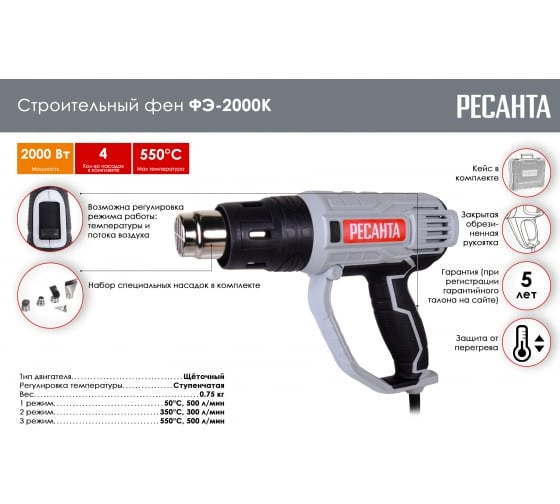 Технические характеристики Строительный фен ФЭ-2000К Ресанта