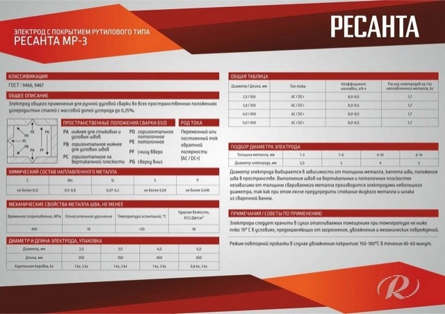 Описание Электрод Ресанта МР-3 Ф5,0 Пачка 0,8 кг
